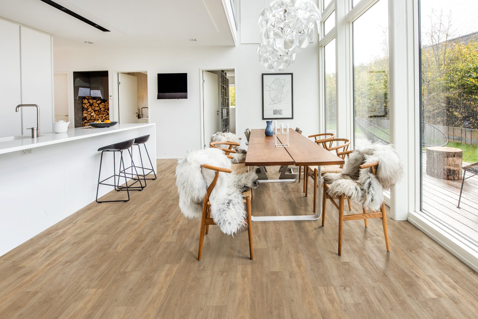 Inspirace přírodou a naturálními prvky je stěžejním rysem bydlení od YIT. Březový háj nacházející se poblíž vznikající zástavby Koivu Zličín proto projektu nedal jen jméno – výraz koivu je ve finštině pojmenováním pro břízu – ale inspiroval také designérku k využití motivu finského národního stromu v rámci samotného provedení vzorového bytu. „Tradičně používáme v projektech převážně bukové a dubové dřevo. Ráz lokality však vybízel k promítnutí dekoru břízy přímo v interiéru. Do obytného prostoru, kterému dominuje bílá sedací souprava a kuchyň v bílém matu s úložnými skříňkami a jídelním stolem v dubovém dekoru, jsme proto vybrali jednoduché doplňky. Z kmene břízy byly vytvořeny odkládací stolky v obývacím pokoji a týž dekor jsme použili pro výrobu dekoračních svícnů. Ze stropu jsme dále spustili závěsné světlo v bílém odstínu, jehož stínidlo připomíná březové listí,“ popisuje Lenka Hlaváčková Schubertová výběr doplňků. V ložnici designérka zvolila tapetu s výraznou černobílou kresbou evokující stromořadí, která je hlavním dekorativním prvkem v místnosti, a k osvěžení prostoru tak postačily už jen polštáře a noční stolky ve vhodně zvoleném odstínu jarní zeleně. Do dětského pokoje naopak vybrala jemnou černobílou tapetu s obrysy ptáků a ptačí motiv zopakovala i na stínidle lustru. Barevnost jinak velmi světlému pokoji dodala sytě červeným kobercem s čísly umístěným před dětskou postelí s úložným prostorem.